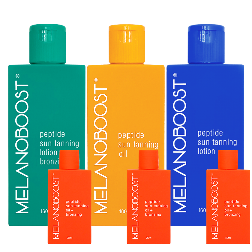 Melanin is the pigment which makes our skin tan. Naturally, melanin is usually only produced when our skin is exposed to UV light, however the biomimetic peptides used by Melanoboost are designed to mimic melanogenesis without UV exposure which allows you to start the tanning process indoors. This is what makes the science of biomimetic tanning technology so game changing!